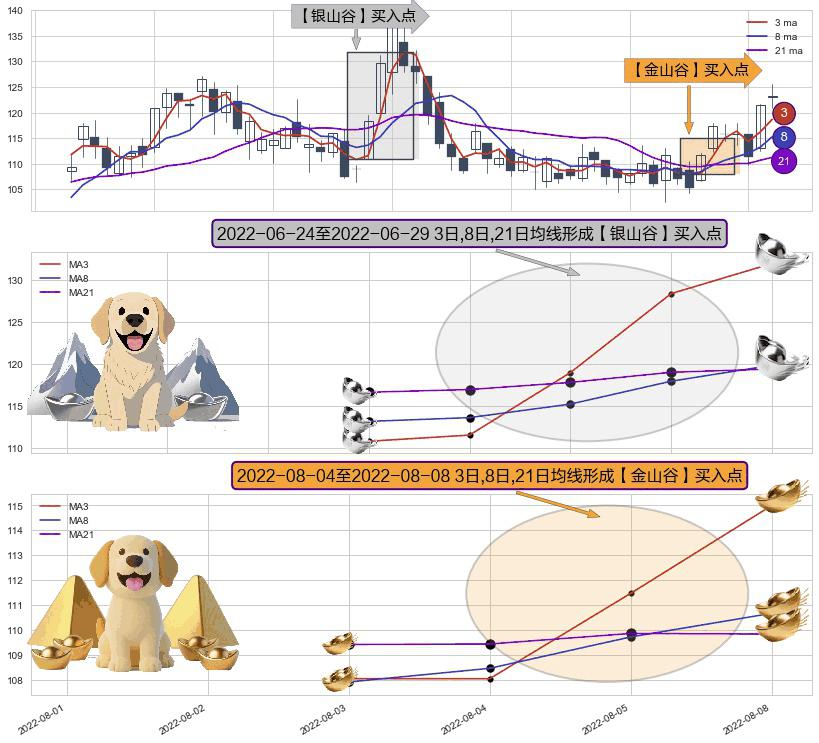 ⚀ 2022-08-05-日至2022-08-08-日显现 3日-8日-21日均线 【金山谷】买入点 其再次确认了买入信号,可靠性更强,买入