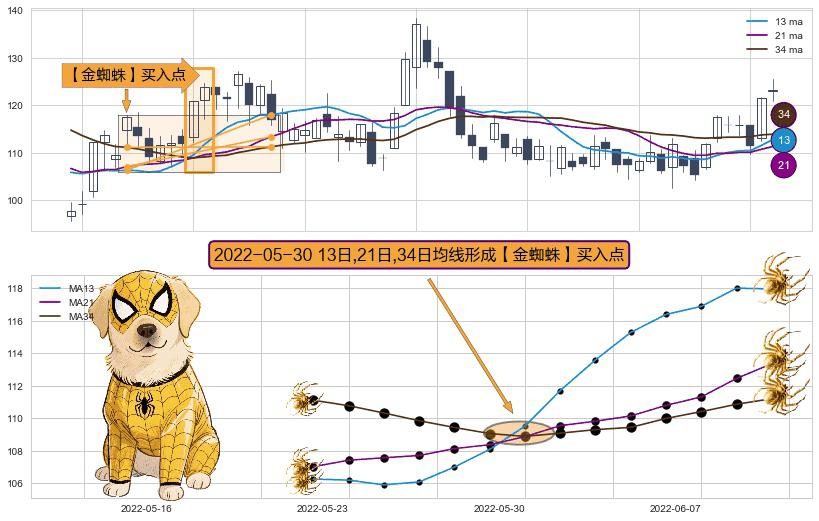 ⚀ 2022-05-30日显现 13日-21日-34日均线 【金蜘蛛】买入点 看多信号,后市看涨,买入