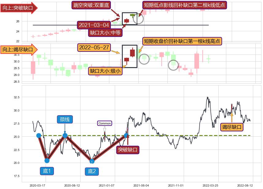 ➣ 突破缺口形成后,后续k已经超过14根,跳空突破双重底关键点后, 出现【轻微回踩】迹象,短期低点影线回补缺口第二根k线低点