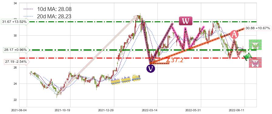 ♘ 支撑价格位27.19,可信任强度68.30%,距离最后交易2022-08-12形成的收盘价格27.90相差 -2.54%