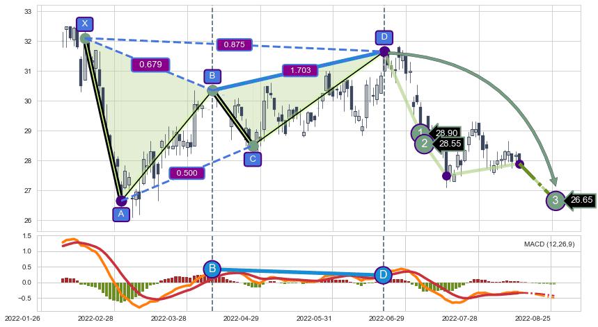 ➢ 谐波价格D点比B点高 ⤴,【MACD】指标D点比B点低 ⤵️
