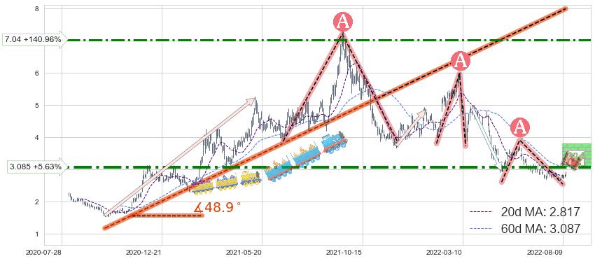 ♘ 阻力价格位3.085,可信任强度71.63%,距离最后交易2022-08-12形成的收盘价格2.920相差 +5.63%