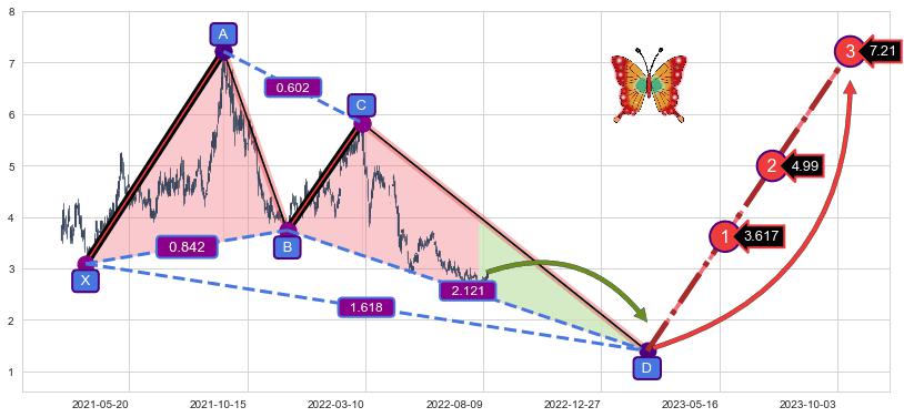 ➣ 未完成【蝴蝶】形态起点X: 2021-03-24, 已到达C点: 2022-03-07, 预测最终D点: 2023-02-20, 共470交易日