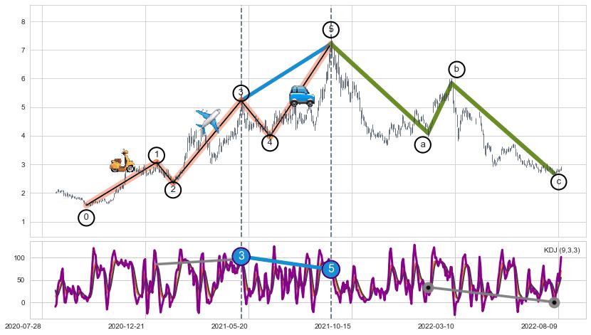 ➣ a,c调整浪MACD, RSI, KDJ走势都【未出现】背离,abc走势延续, 5浪反转概率增强