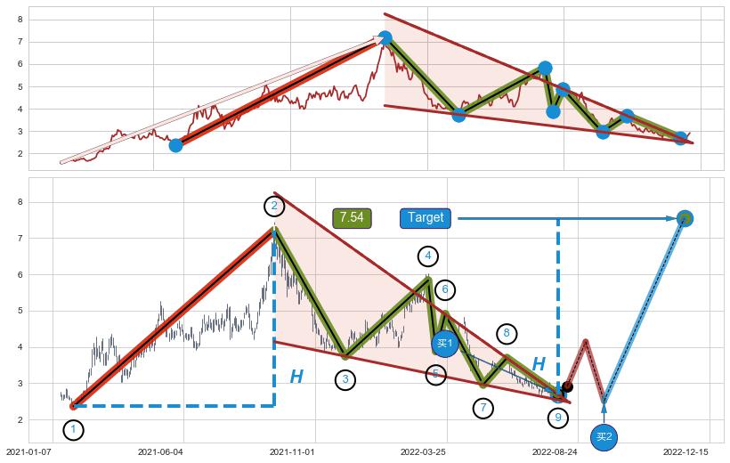 ➢ 【买1】: 激进型 买点 →(2022-08-03: 2.686 )形成突破降🚩楔型【整理】形态