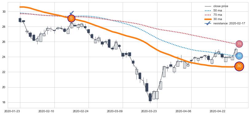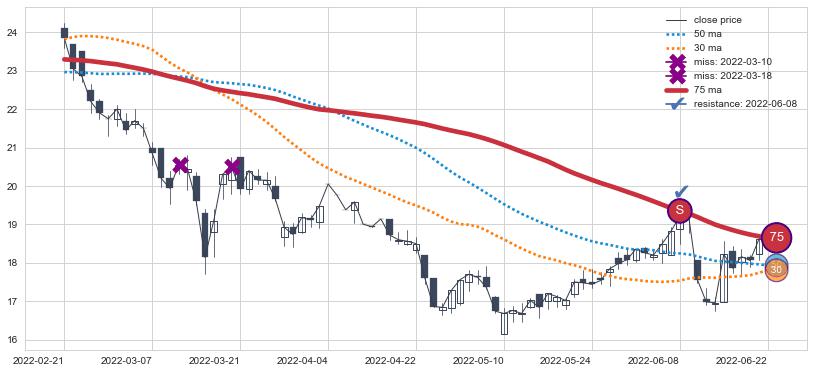 下跌趋势2021-03-19-2021-10-07,均线50, 75确认关键阻力2处