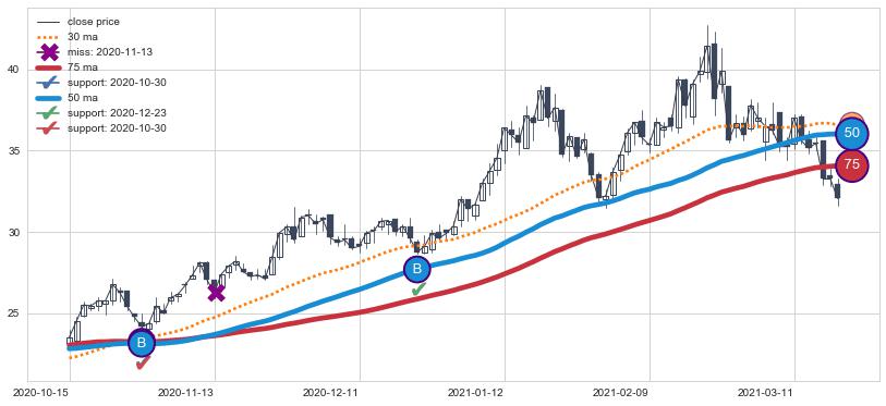 上涨趋势2020-10-15-2021-03-19,均线50, 75确认关键支撑2处