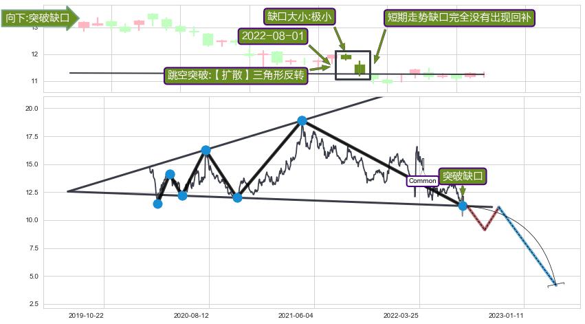 | 7 🅚:下跌两颗星 | 下跌三颗星 ➕ 📐:扩散三角反转下行突破支撑位破位, 猜想持续下沉下跌,被突破的支撑位已变为阻力位 ☞ 看空信号 ⇥ 【🅚线】交织【图形】⇥ 综合量化分数: 42 | > |