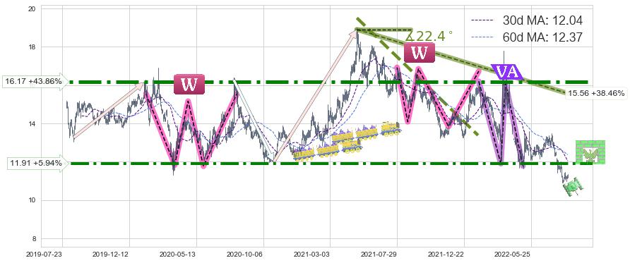 ♘ 阻力价格位16.17,可信任强度94.38%,距离最后交易2022-08-12形成的收盘价格11.24相差 +43.86%
