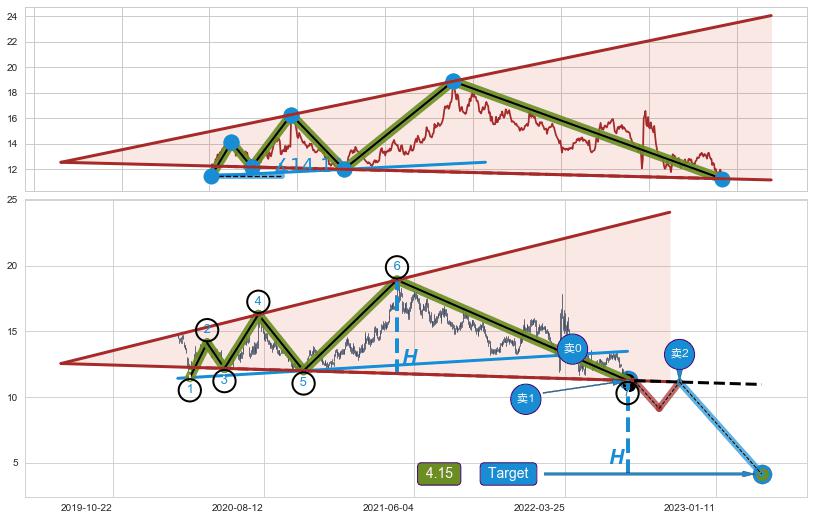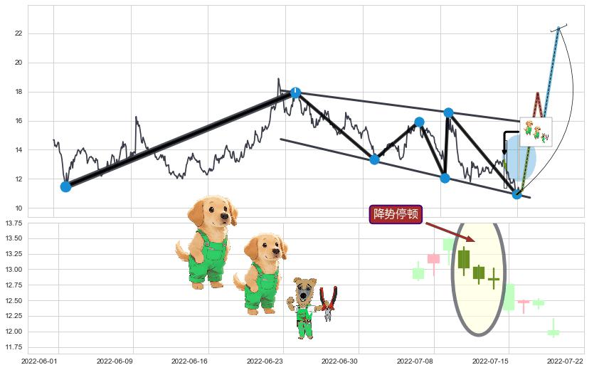 | 14 🅚:上探下跌 ➕ 📐:扩散三角反转下行突破支撑位破位, 猜想持续下沉下跌,被突破的支撑位已变为阻力位 ☞ 看空信号 ⇥ 【🅚线】交织【图形】⇥ 综合量化分数: 37 | > |