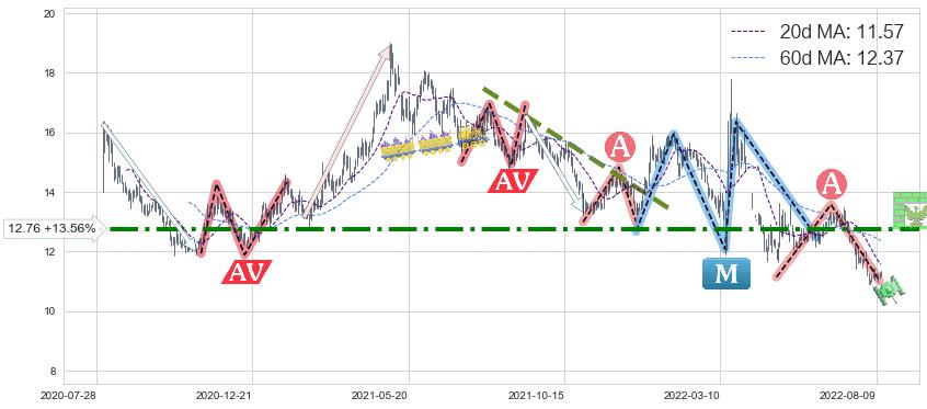 ➢ 【已达成】最小【整理】第一目标价格→(2022-08-02: 11.16 ), 后续继续【整理】下跌动力依然存在,下跌空间适中