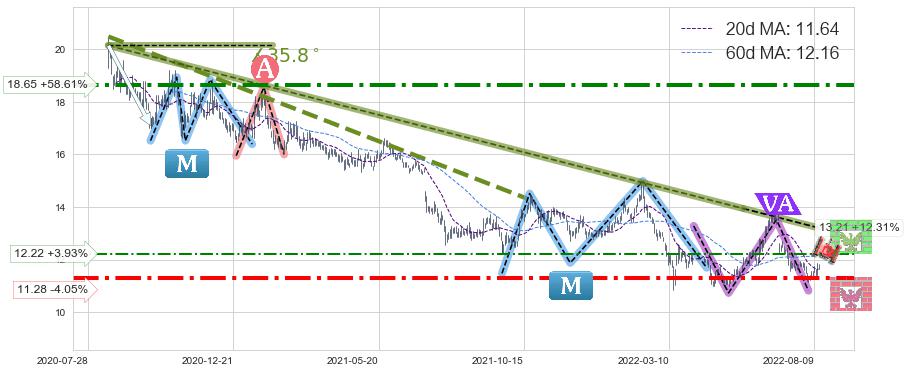 ♘ 阻力价格位12.22,可信任强度52.30%,距离最后交易2022-08-12形成的收盘价格11.76相差 +3.93%