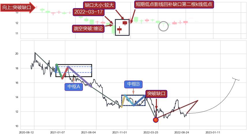 ➣ 突破缺口形成后,后续k已经超过14根,跳空突破缠论买卖点关键点后, 出现【轻微回踩】迹象,短期低点影线回补缺口第二根k线低点