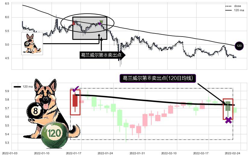 ⚀ 2022-02-22-日显现 葛兰威尔均线 120日均线 第⑧卖出点 下降趋势的中继信号,后市看跌,卖出信号