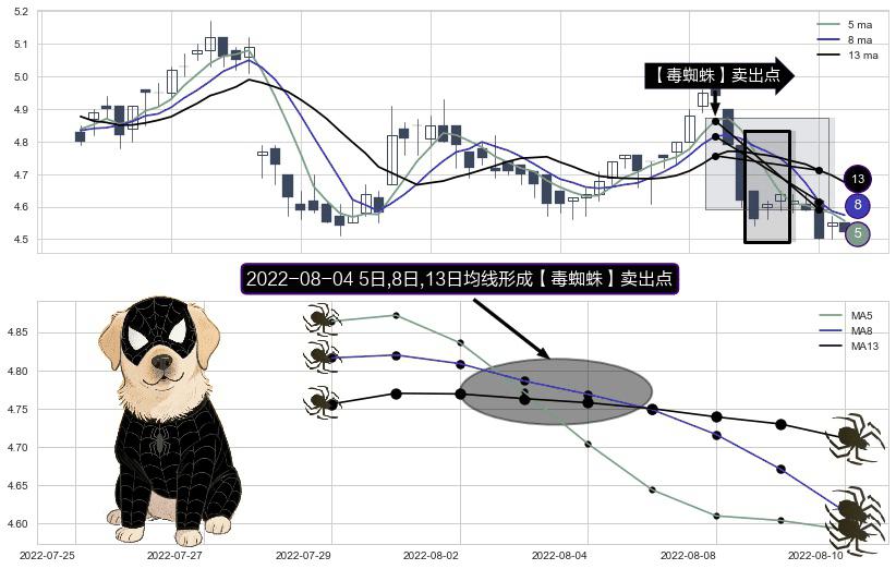 ⚀ 2022-08-04日显现 5日-8日-13日均线 【毒蜘蛛】卖出点 看空信号,后市看跌,卖出