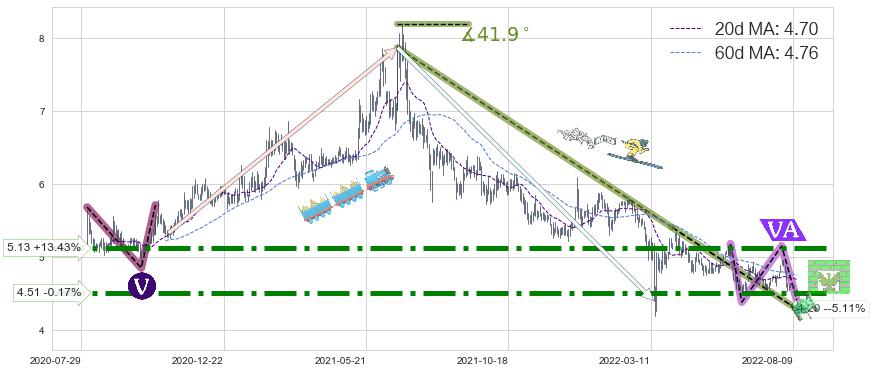 ♞ 20日均线:4.70,60日均线:4.76→ 快线<慢线