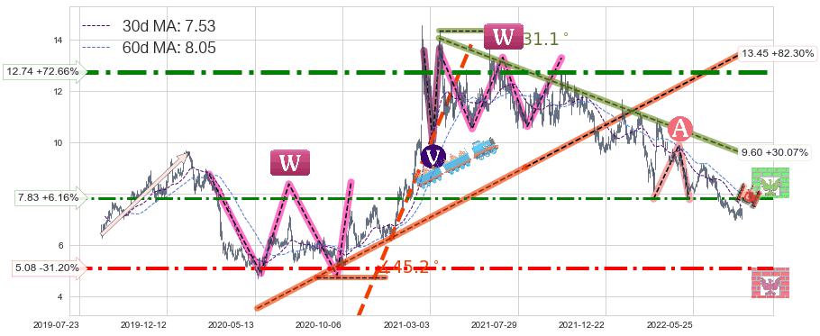 ♘ 阻力价格位7.83,可信任强度60.12%,距离最后交易2022-08-12形成的收盘价格7.38相差 +6.16%