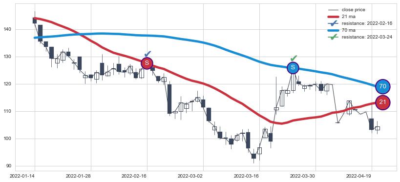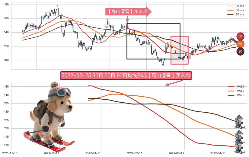 ⚀ 2022-01-03日-2022-04-21日显现 30日-60日-90日均线 【高山滑雪】买入点 看多信号,后市看涨,买入