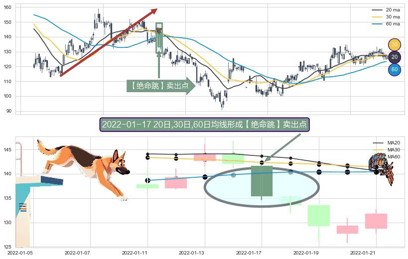 ⚀ 2022-01-17日显现 20日-30日-60日均线 【绝命跳】卖出点 看空信号,后市看跌,卖出