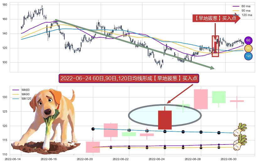⚀ 2022-06-24日显现 60日-90日-120日均线 【旱地拔葱】买入点 看多信号,后市看涨,买入