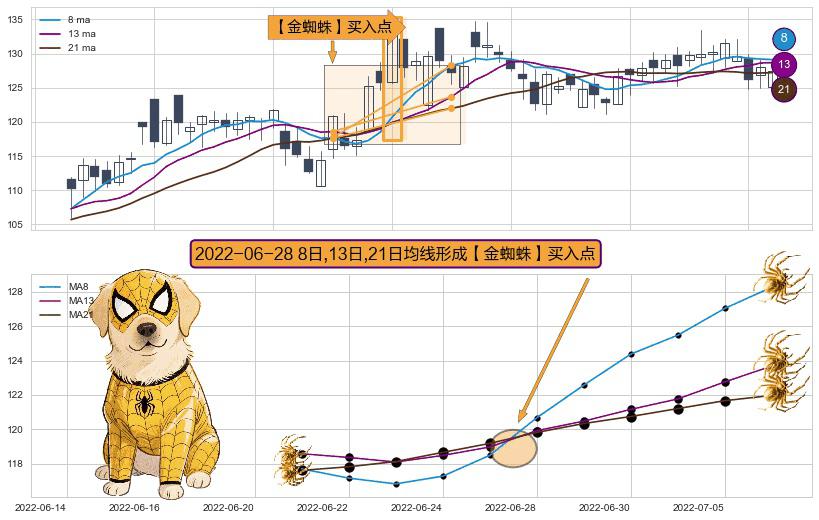 ⚀ 2022-06-28日显现 8日-13日-21日均线 【金蜘蛛】买入点 看多信号,后市看涨,买入