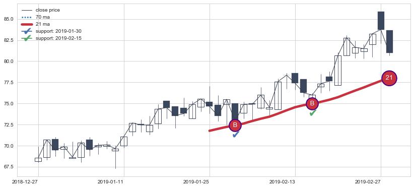 ⚀ 中期均线MA13上穿长期均线MA21形成的交叉是标准 黄金交叉