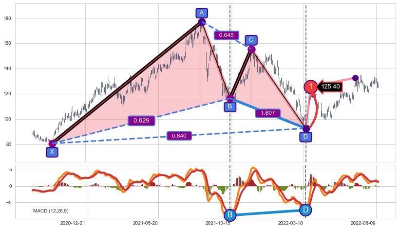 ➢ 谐波价格D点比B点低 ⤵,【MACD】指标D点比B点高 ⤴️