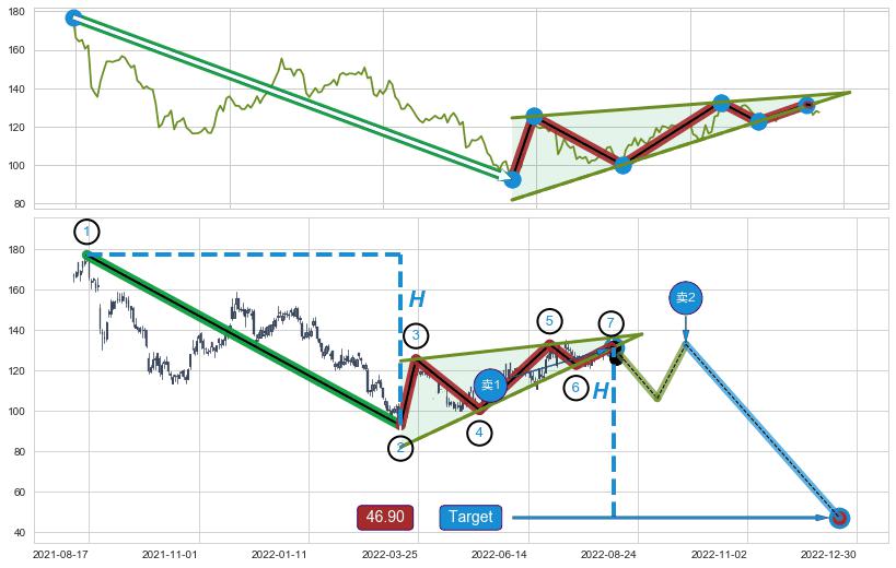 ➢ 最小中继整理跌幅→𝐇: 84.35 (𝐇楔型旗杆的长度:楔型起点→顶点)