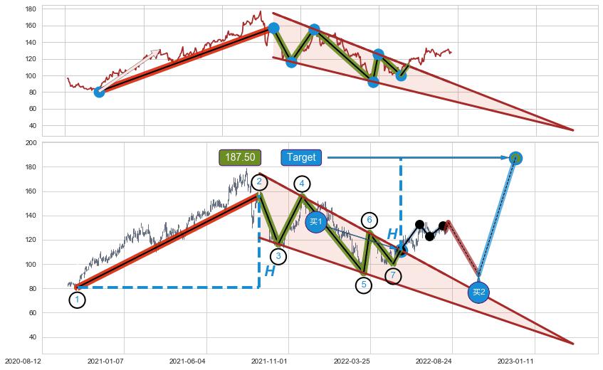 ➢ 最小中继整理涨幅→𝐇: 76.05 (𝐇楔型旗杆的长度:楔型起点→顶点)