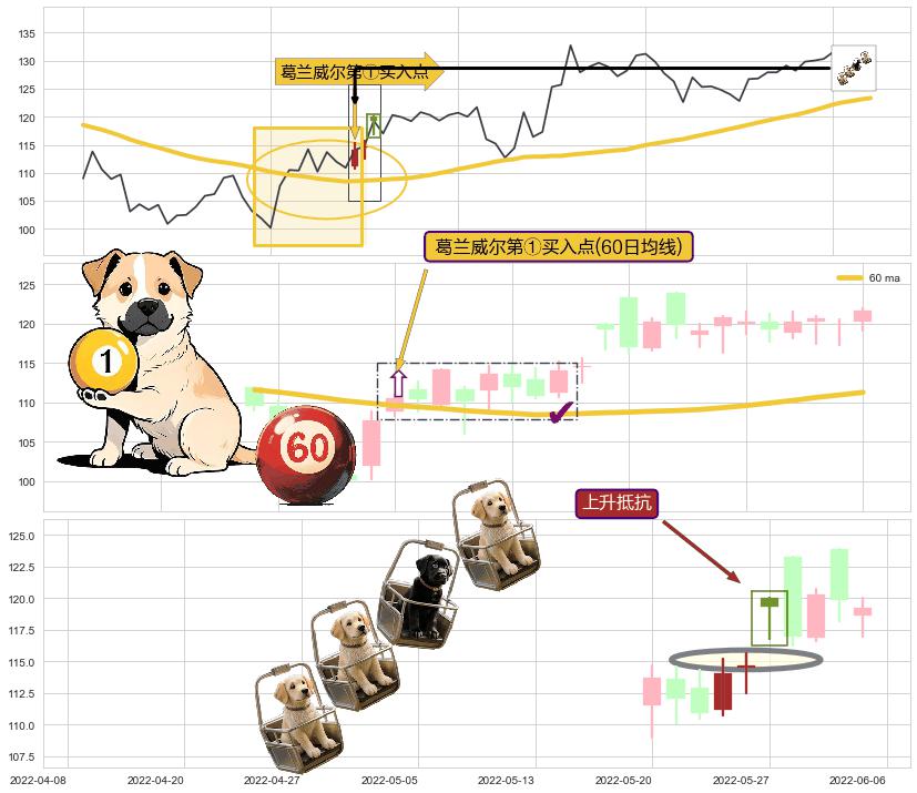 ➢ 低点影线(2022-05-30: 116.30 )→回踩→第二根k线低点(2022-05-27: 116.80 )