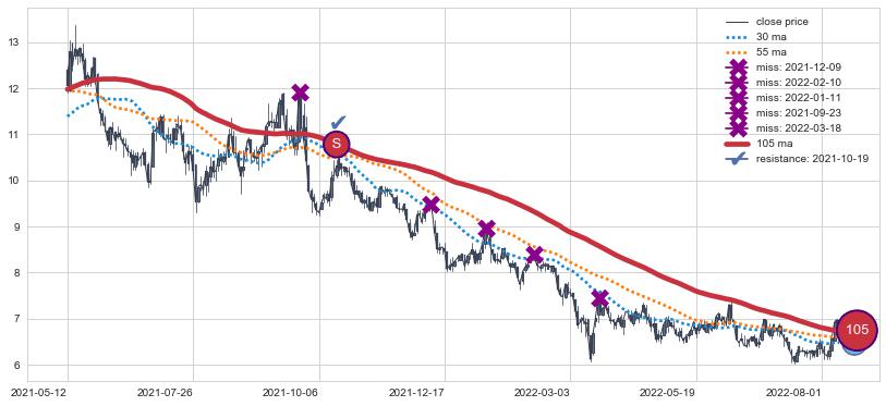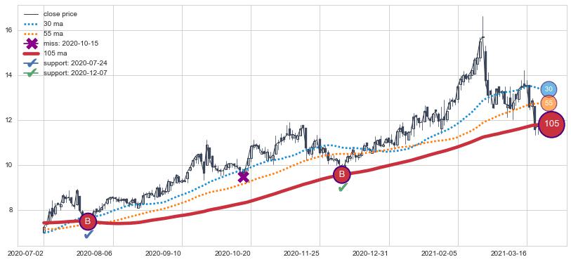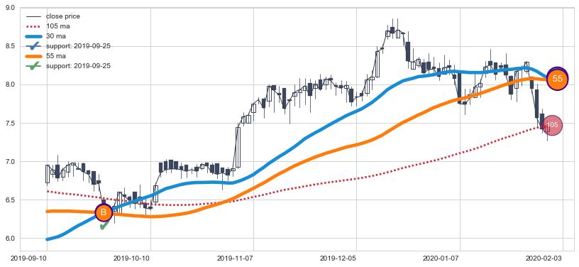 ⚁ MA60和MA90走势平行,且始终保持在短距离内,MA120始终在短中期均线上方,与短中期均线保持一定的距离,微微下行