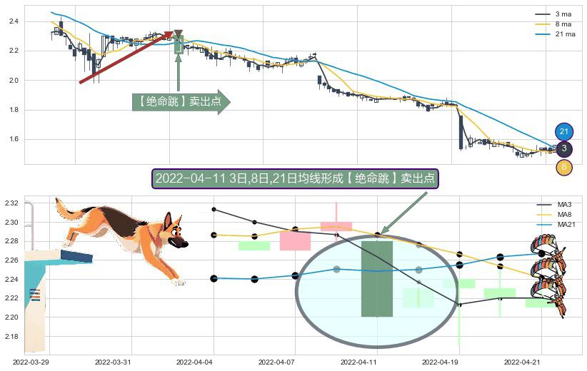 形态多维评估: ⚀ 2022-04-11日显现 3日-8日-21日均线 【绝命跳】卖出点 看空信号,后市看跌,卖出
