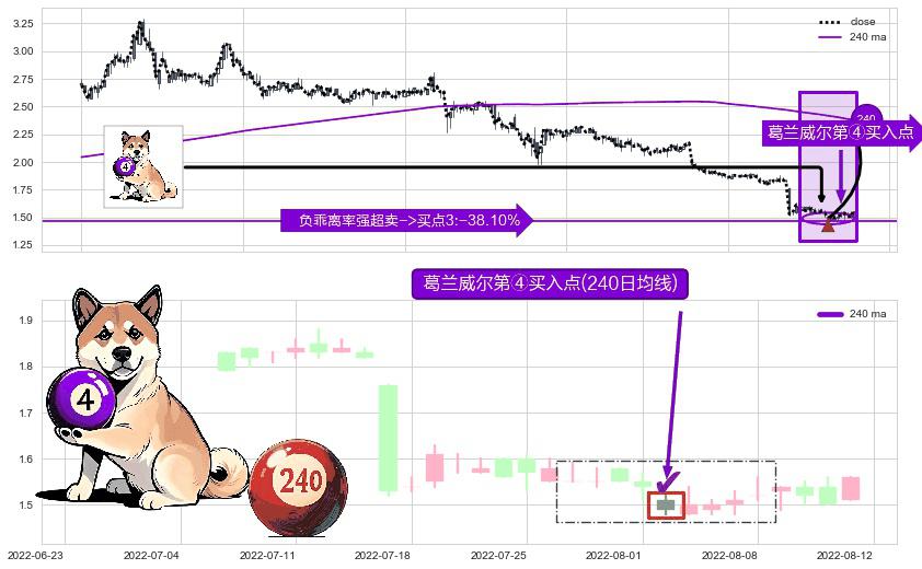 形态多维评估: ⚀ 2022-08-02-日显现 葛兰威尔均线 240日均线 第④买入点 下降趋势均值回复的短线反弹信号,后市看涨,买进信号
