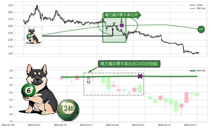 形态多维评估: ⚀ 2022-02-18-日显现 葛兰威尔均线 240日均线 第⑥卖出点 走势反转见顶信号,后市看跌,卖出信号