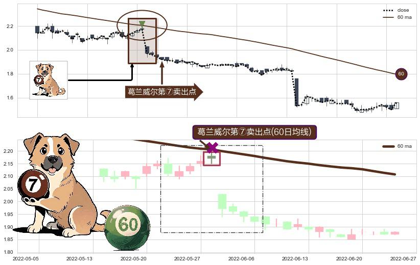 形态多维评估: ⚀ 2022-05-30-日显现 葛兰威尔均线 60日均线 第⑦卖出点 下降趋势的中继信号,后市看跌,卖出信号