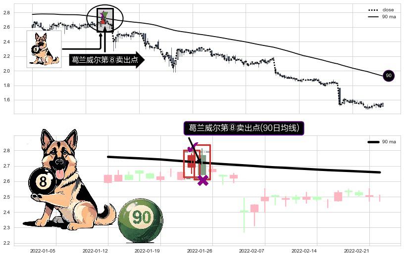 形态多维评估: ⚀ 2022-01-25-日显现 葛兰威尔均线 90日均线 第⑧卖出点 下降趋势的中继信号,后市看跌,卖出信号