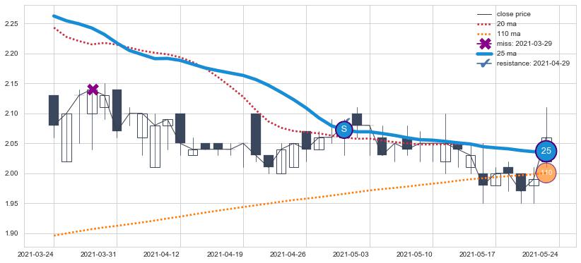 下跌趋势2021-03-24-2021-05-24,均线25确认关键阻力1处