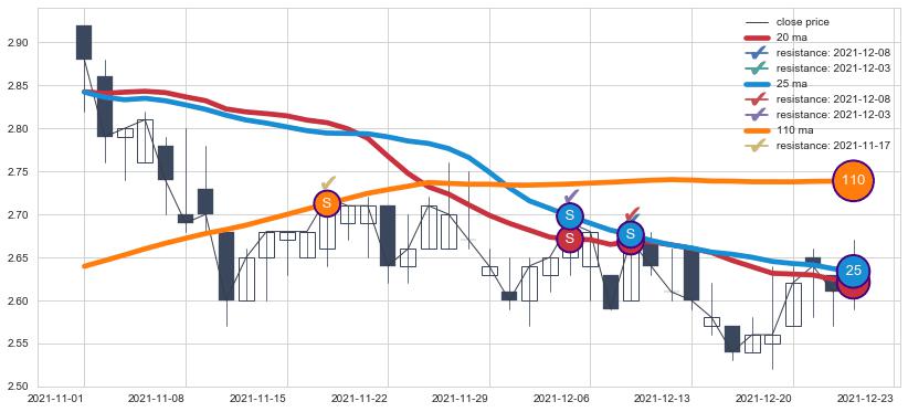 下跌趋势2021-11-01-2021-12-23,均线25, 20, 110确认关键阻力3处