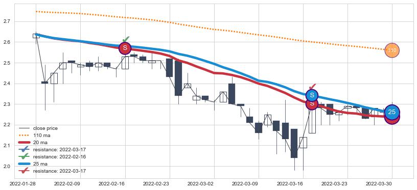下跌趋势2022-01-28-2022-03-30,均线25, 20确认关键阻力2处