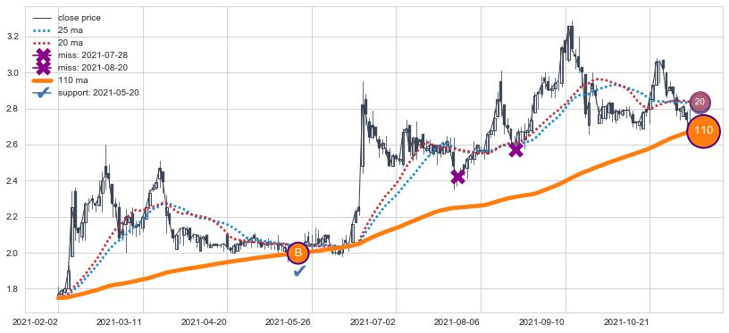 上涨趋势2021-02-02-2021-11-08,均线110确认关键支撑1处
