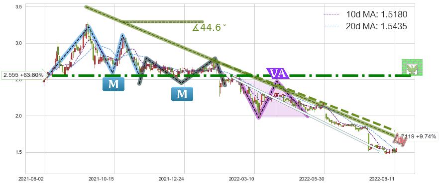 从2021-09-13至2022-08-11,共包含221个交易日,阶段股价下跌-71.57%,阶段股价变动位移路程比: 1 : 4,下跌趋势角度: 44.6