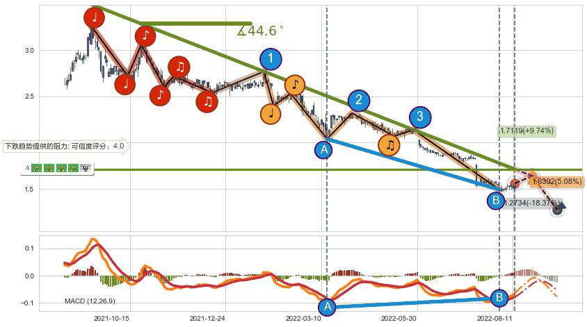 ♘ 在最后的下跌阶段2021-09-13至2022-08-11,存在 持续未破位的阻力位 ,阻力价格1.7119,可信任强度84.98%,其距离最后价格1.5600相差 +9.74%