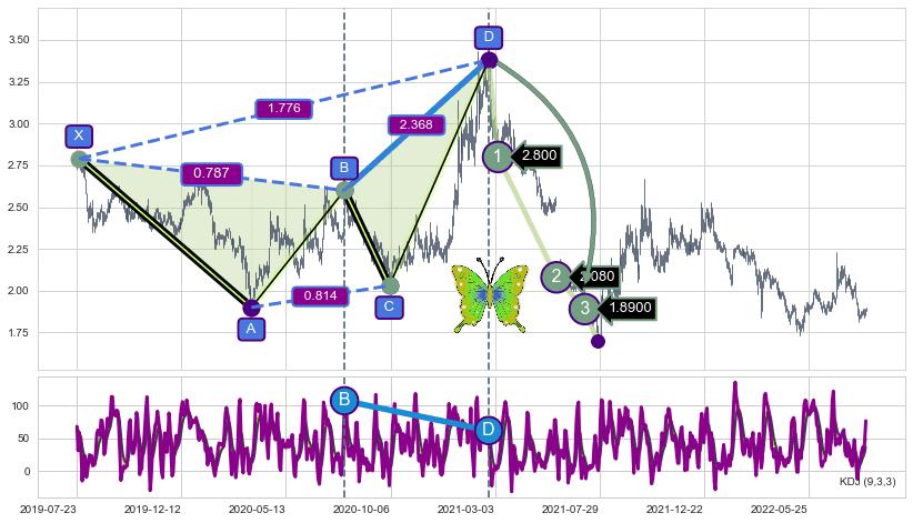 ➣ 已完成【蝴蝶】形态起点X: 2019-07-25, 终点D: 2021-02-23, 共393交易日