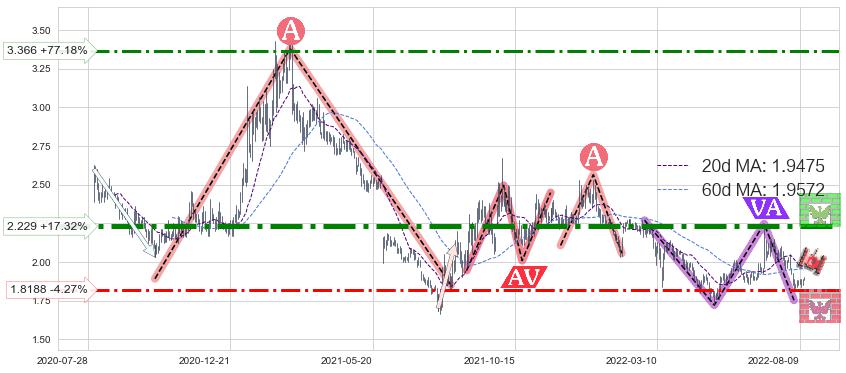 ♘ 阻力价格位2.229,可信任强度92.24%,距离最后交易2022-08-12形成的收盘价格1.9000相差 +17.32%