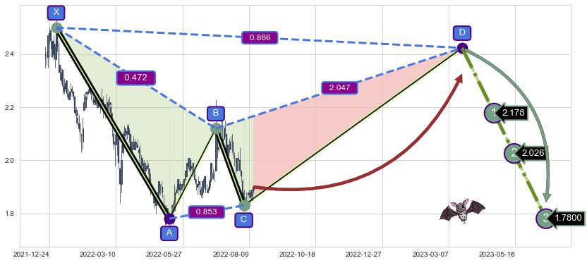 ➣ 未完成【蝙蝠】形态起点X: 2022-01-03, 已到达C点: 2022-08-03, 预测最终D点: 2023-03-21, 共306交易日