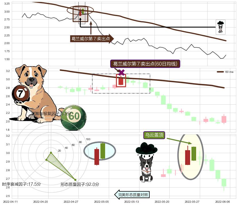 | 6 🅚:下跌螺旋桨 ➕ 🎢:【乌云密布】卖出点均线组合卖出点信号形成后,猜想后续下行持续,下跌加速(趋势跟踪) ☞ 看空信号 ⇥ 【均线】交织【🅚线】⇥ 综合量化分数: 39 | > |