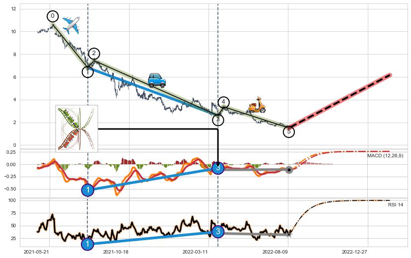➣ 第一, 三, 五浪下跌动能逐渐【衰弱变小】,趋势呈现不稳迹象