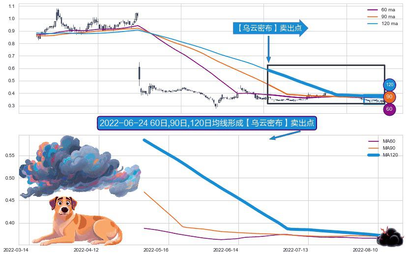 ⚀ 2022-05-04日-2022-08-12日显现 60日-90日-120日均线 【乌云密布】卖出点 看空信号,后市看跌,卖出