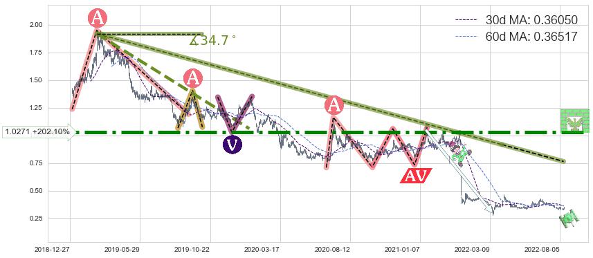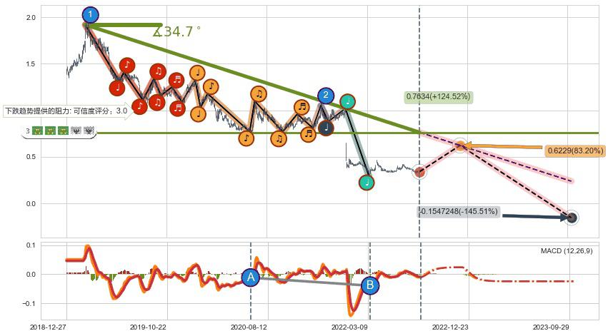 ♘ 在最后的下跌阶段2019-02-25至2022-04-01,存在 持续未破位的阻力位 ,阻力价格0.7634,可信任强度73.98%,其距离最后价格0.34000相差 +124.52%