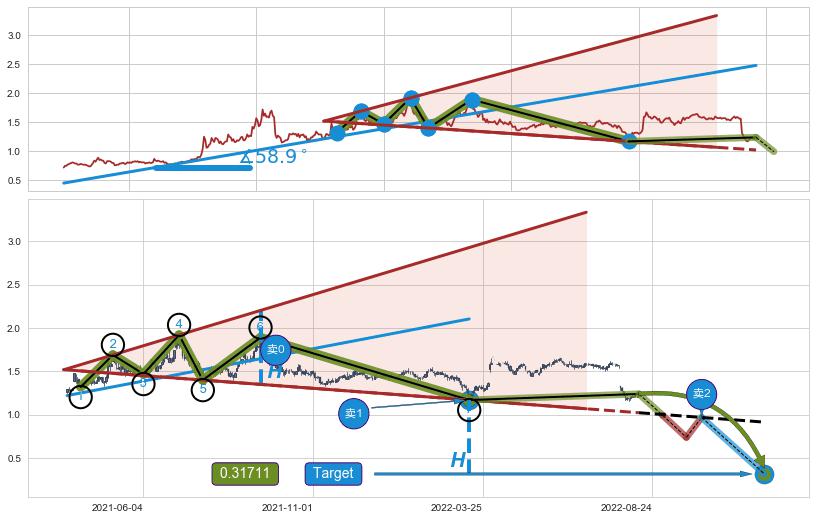 ➣ 【未确认突破,预测即将形成突破】【扩散】三角形反转起点:2021-04-13, 预测突破点:2022-03-15,形态共230交易日